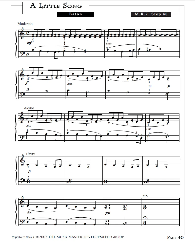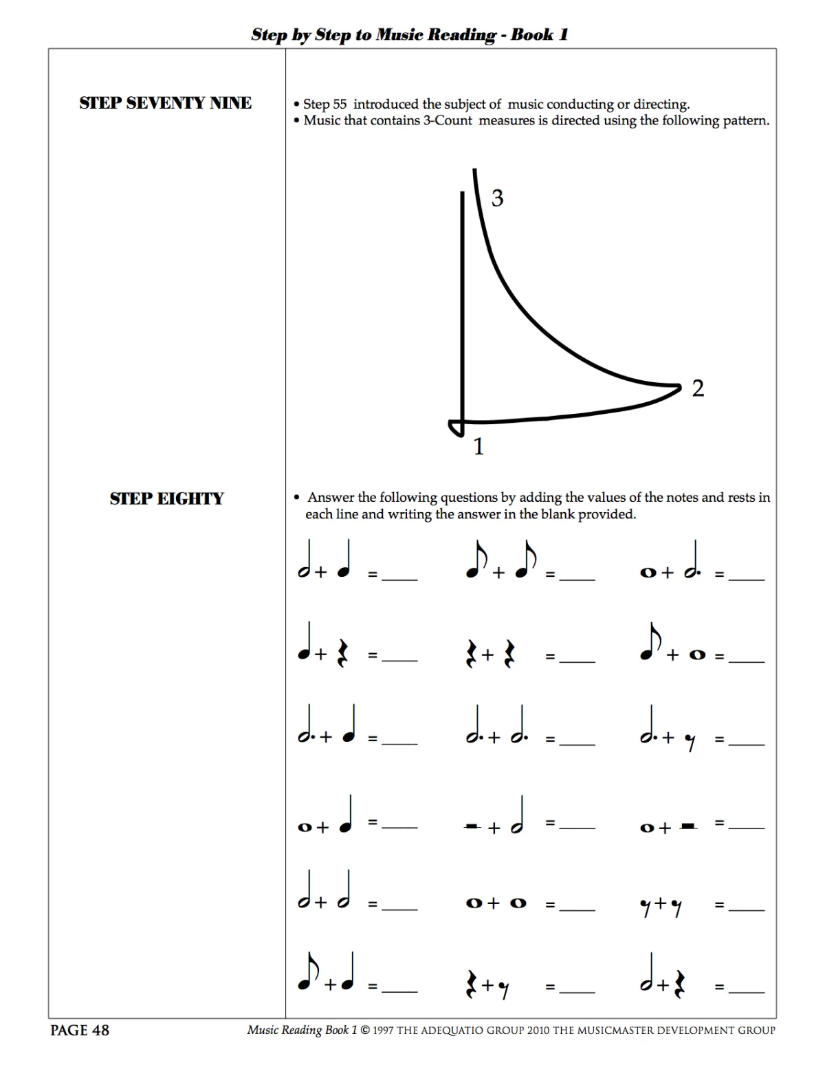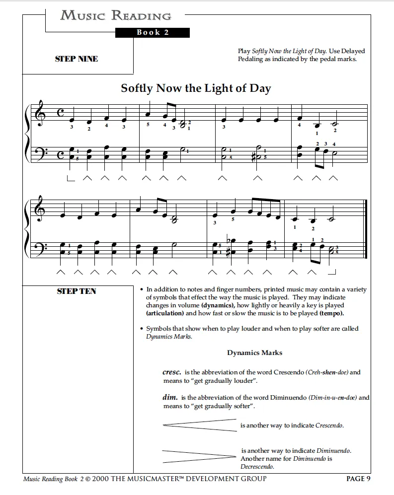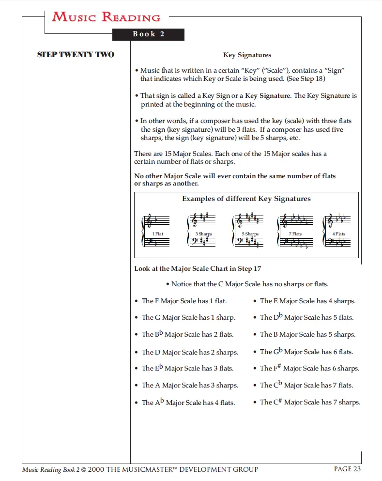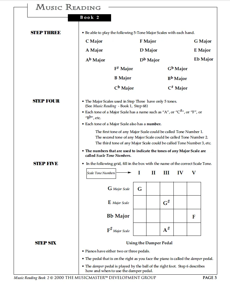 Material includes more conducting, additional scale building, defines the concept of "key" and scale, teaches the student to memorize the 15 Major Key Signatures, dynamics and articulation marks, pedal markings, etc.