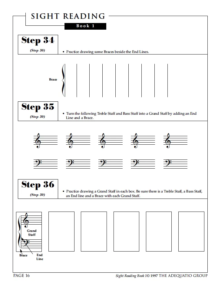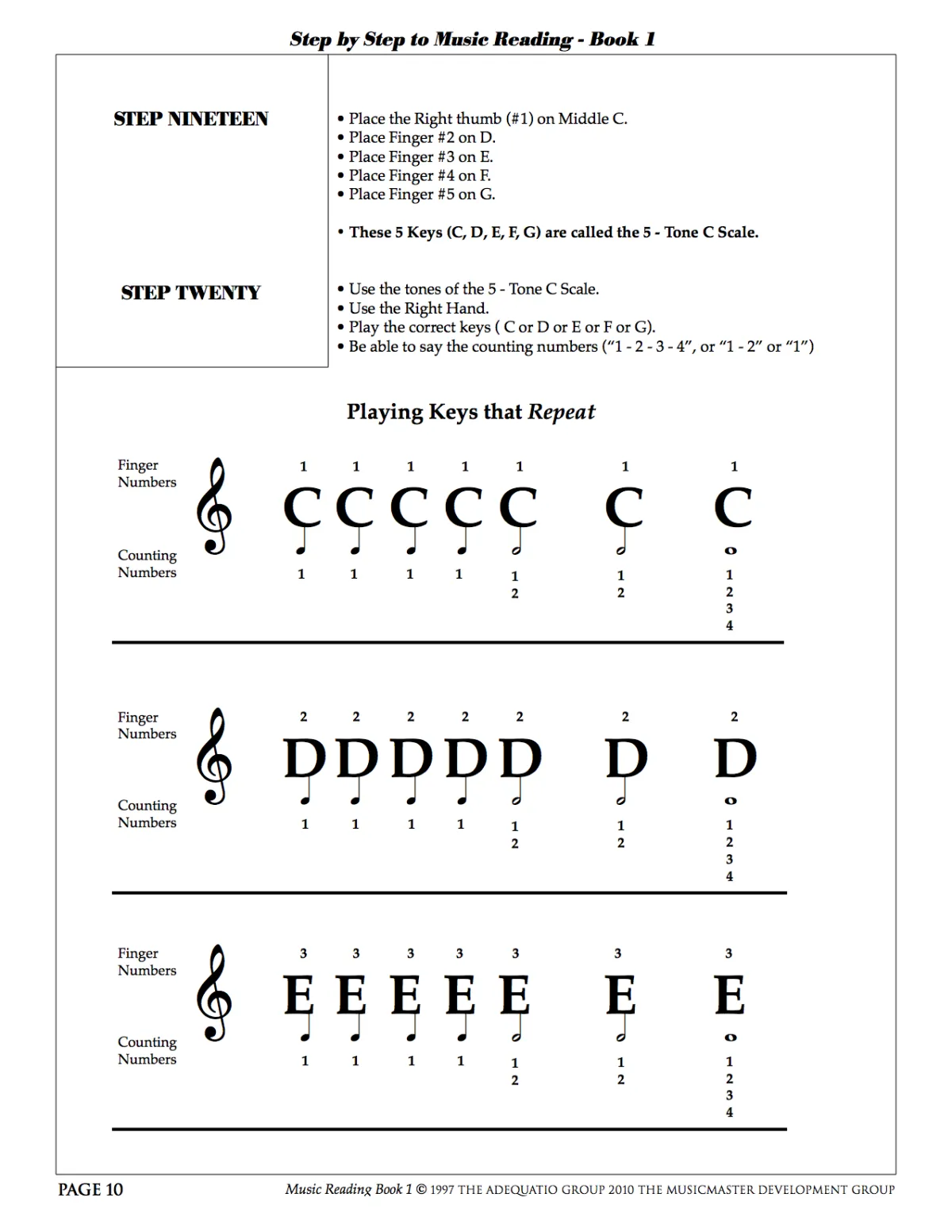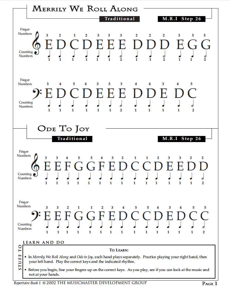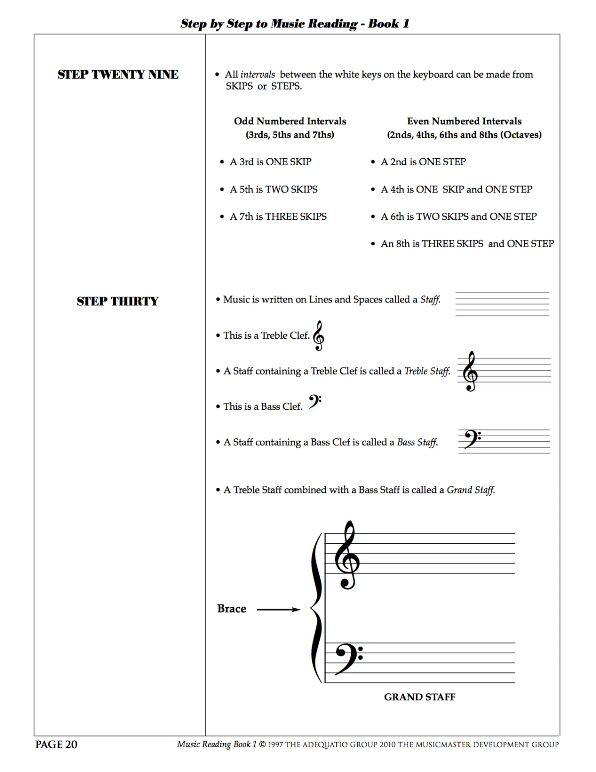 Contains a very smooth, easy approach to reading and playing music in the Grand Staff. Eliminates the possibility of only reading finger numbers. Eliminates fear of keyboard and staff as the players move away from Middle C.