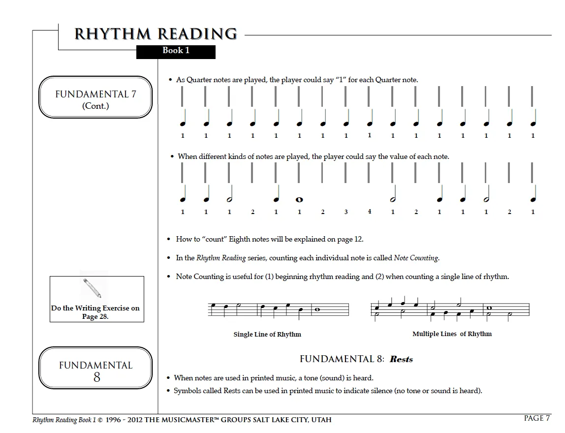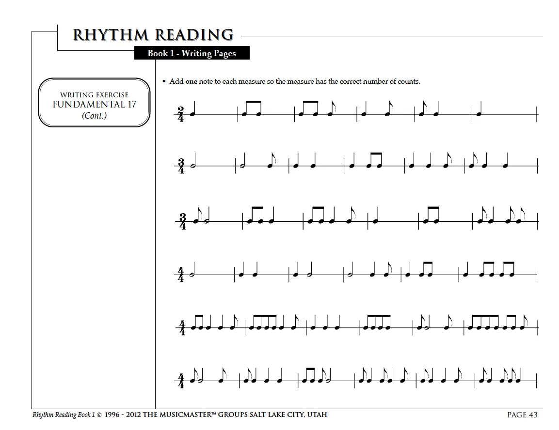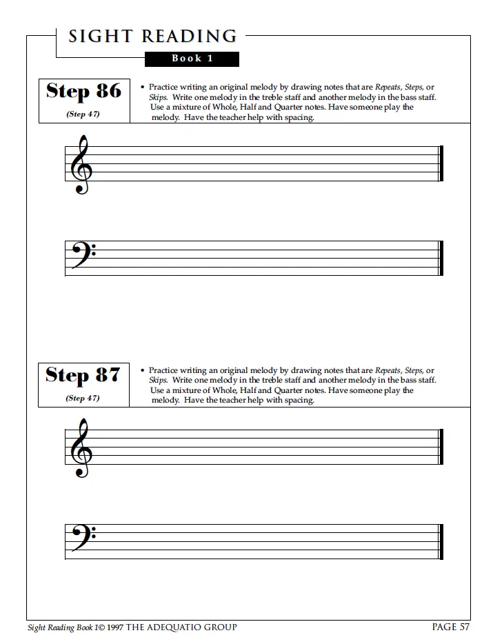Drills, writing exercises and the drawing of a variety of musical symbols. Recognizing and playing of patterns is introduced to facilitate the student's music reading fluency.